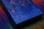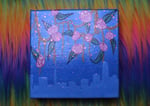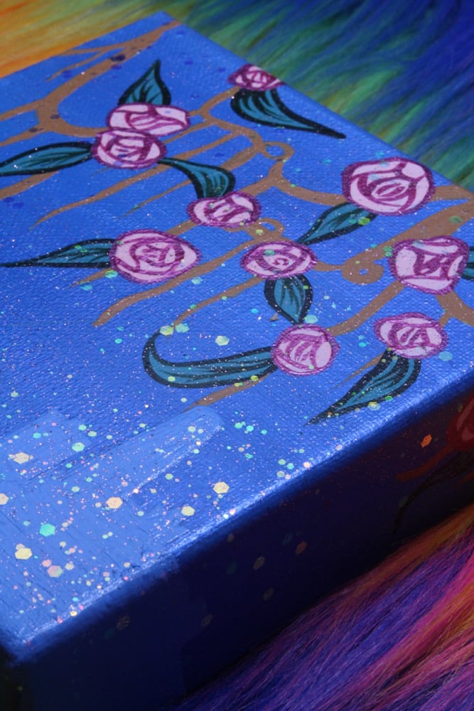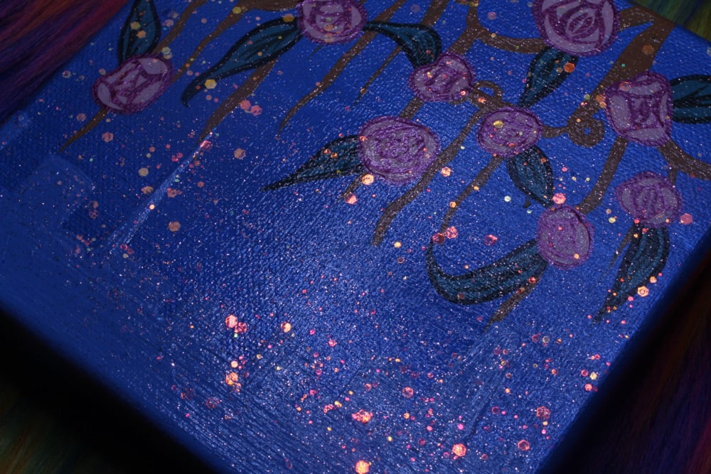 This cotton canvas showcases an exclusive illustration inspired by one of many San Francisco Skylines. Featuring dripping brown vines, wrapped around by light pink roses, layered with blue and pink holographic glitter. Perfect for a home in need of a touch of art. Each piece is meticulously crafted to ensure vibrant colors and lasting quality.