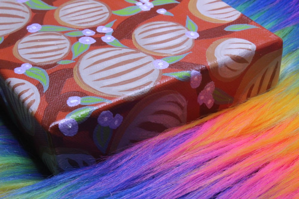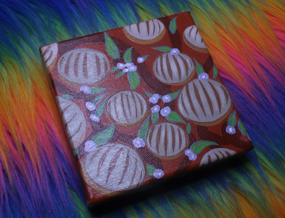 This hand-painted 6x6 stretched cotton canvas showcases an exclusive illustration inspired by Guatemalan pan dulce, specifically what is known as the concha. This bread is found in Mexico and other Central American countries. This painting features toasty conchitas. Add this 1/1 painting to your kitchen, office, or dinning room, or any surface that needs a touch of art. Each piece is meticulously crafted to ensure vibrant colors and lasting quality.