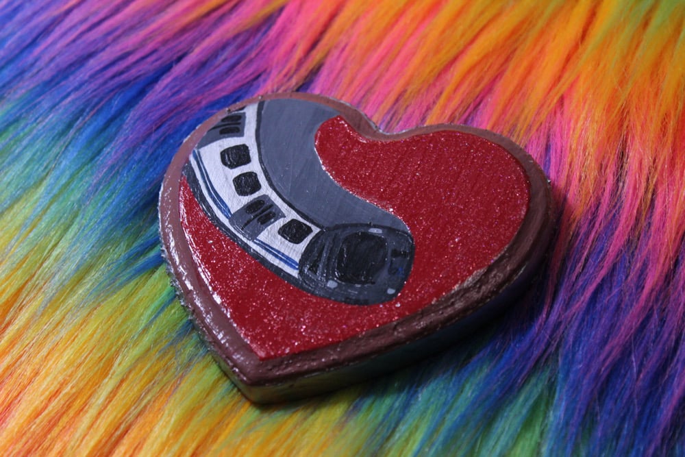 This wood heart showcases an exclusive illustration inspired by BART. Red tones and glitter. It’s perfect for personalizing your laptop, water bottle, journal, or any surface that needs a touch of art. Each piece is meticulously crafted to ensure vibrant colors and lasting quality.